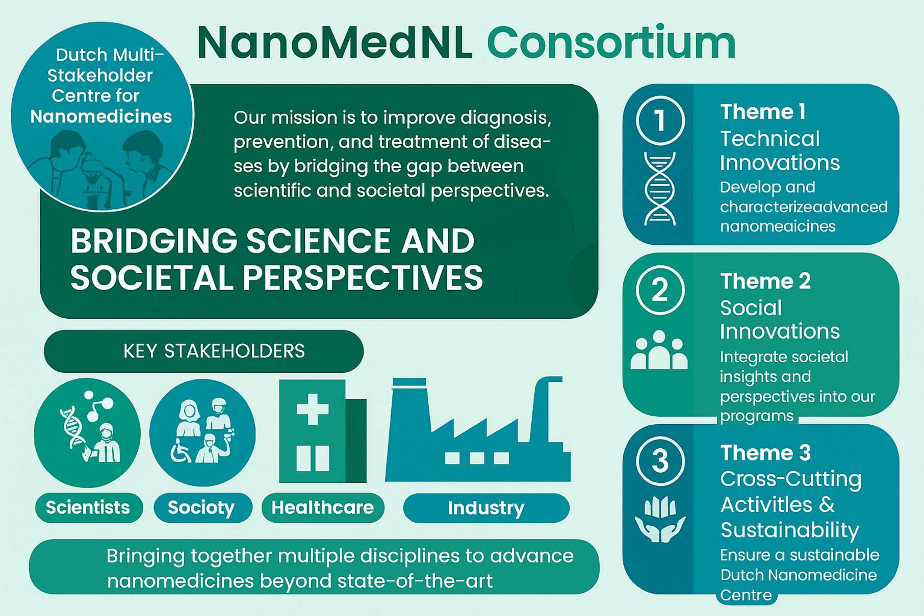 NanoMedNL is a Dutch initiative that aims to bridge the gap between scientific advancements and societal perspectives of nanomedicines, ultimately leading to improved diagnosis, prevention and treatment of diseases through nanomedicines. It seeks to create a multi-disciplinary and multi-sectorial framework for nanomedicine research and development.